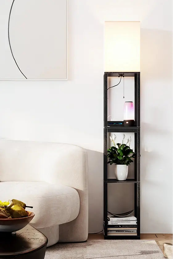 Our Floor Lamp combines elegant illumination with thoughtful convenience. The soft cloth shade casts three perfect light temperatures while real solid wood adds natural warmth to any space. Charge up to four devices simultaneously with built-in USB ports and outlets—keeping your sanctuary clutter-free. The clever drawer safely tucks away small essentials, while three shelves beautifully display your treasures. This Asian-inspired design brings both function and grace to any corner, transforming ordinary moments into comfortable experiences in the home you cherish.