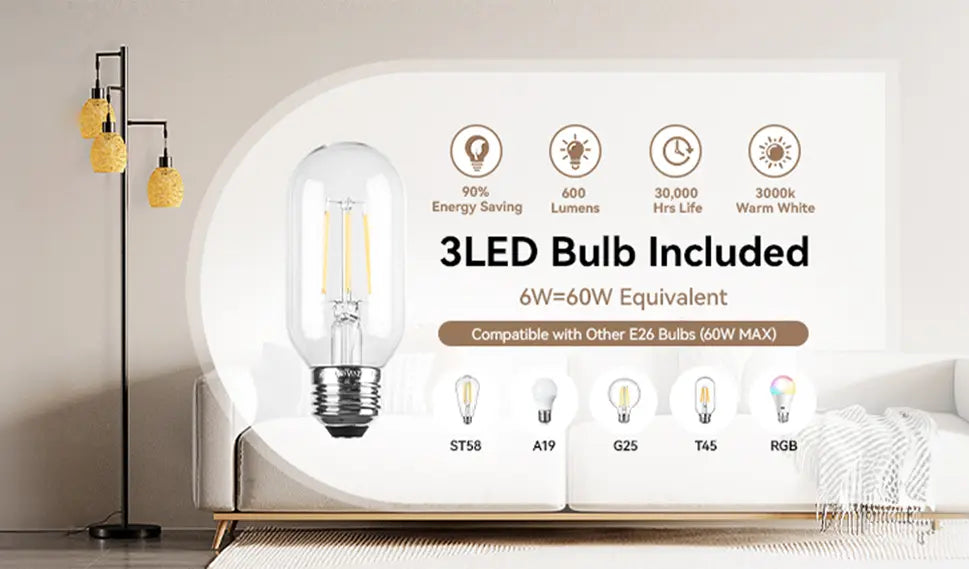 Compatible with various E26 bulbs, including LEDs, Edison, and smart bulbs. Comes with three LED Edison bulbs (3*6w) for instant use.